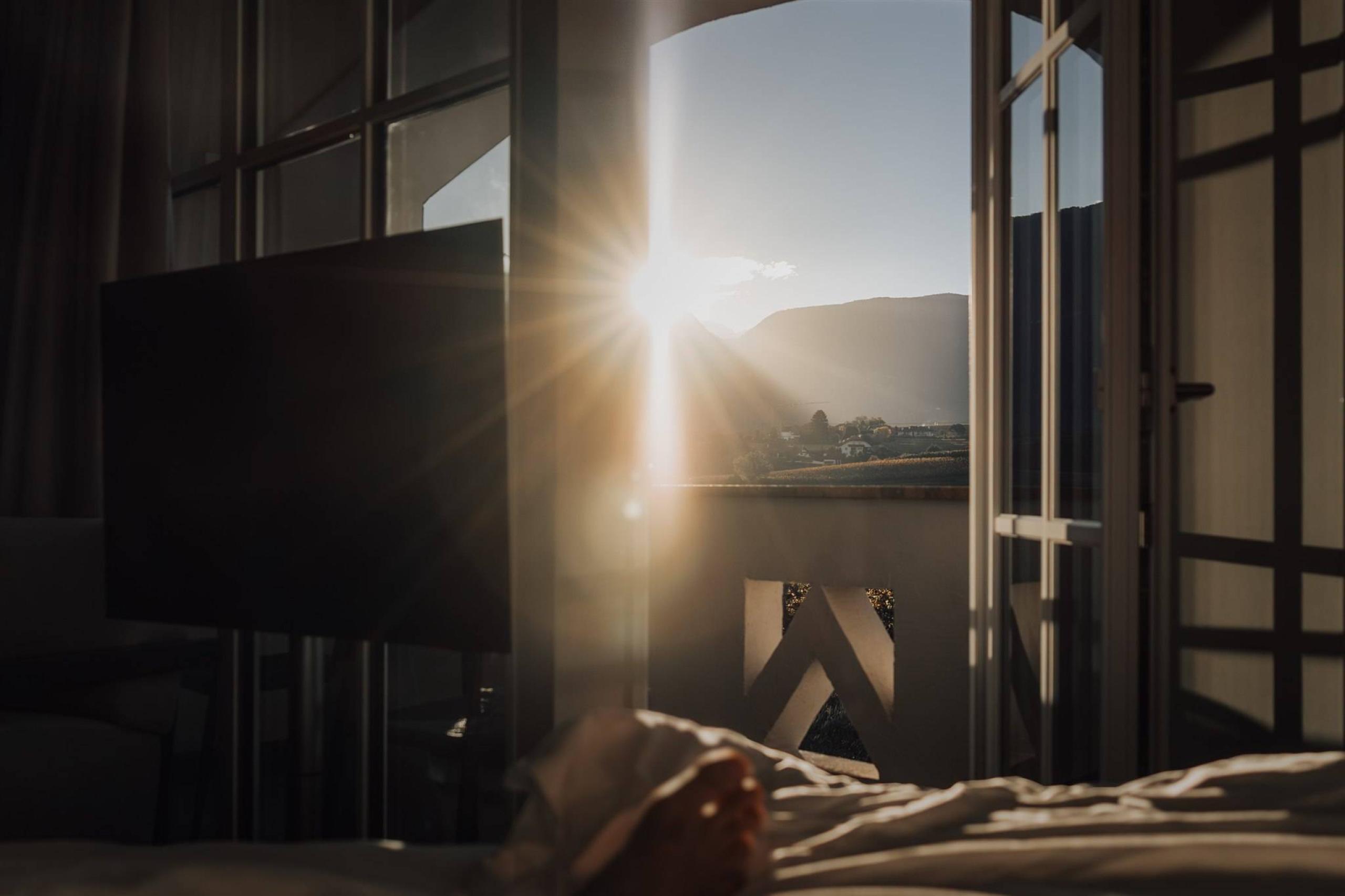 The cosy double rooms on the second floor are around 25m² in size and are the perfect retreat for a break for two. Real wood flooring and underfloor heating provide cosy warmth, while air conditioning ensures pleasant coolness on warm days. From the balcony, you can enjoy the view of the mountain panorama and the vineyards, preferably with an espresso from your own coffee machine in your hand.
